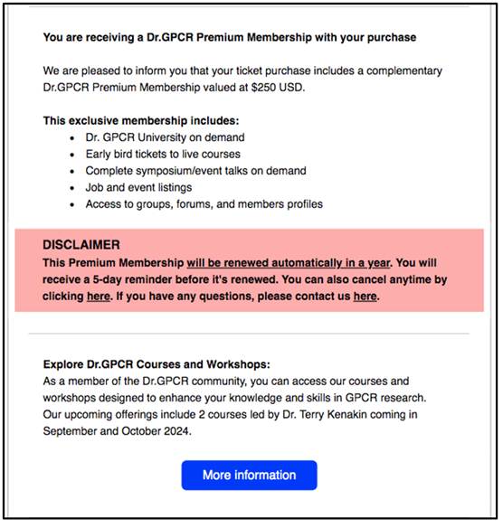 12. ***You must cancel your Dr. GPCR Premium Membership within one year or you will be automatically charged for another year of benefits. To cancel your automatic renewal, there is a button at the bottom of your registration ticket that looks like this. Follow the link to immediately cancel your renewal. You will still have one year of premium benefits from the day you register for the Workshop.