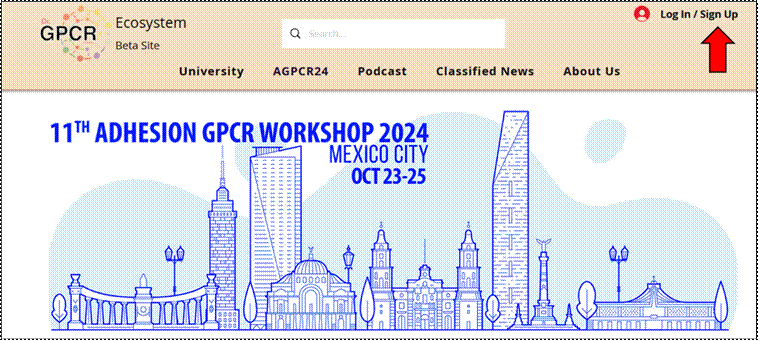 2. To sign up for the Dr. GPCR Ecosystem, click the button in the top right corner of the webpage titled “Log In/Sign Up”