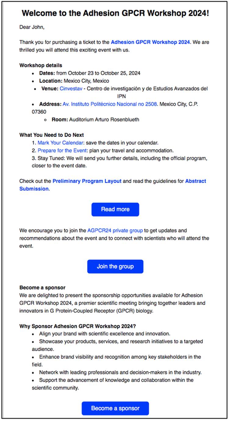 11. You will receive email confirmation of your Workshop registration that looks like this. This is your registration ticket. Your credit card will show a charge for “Registration for Adhesion GPCR Workshop 2024.”